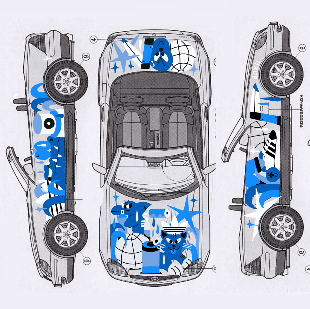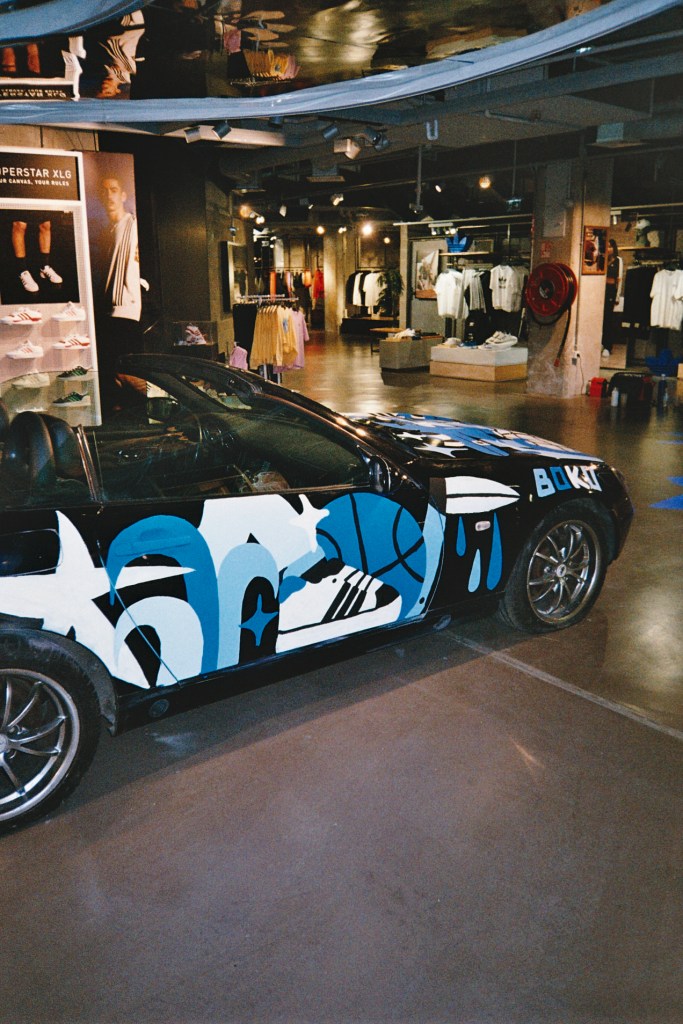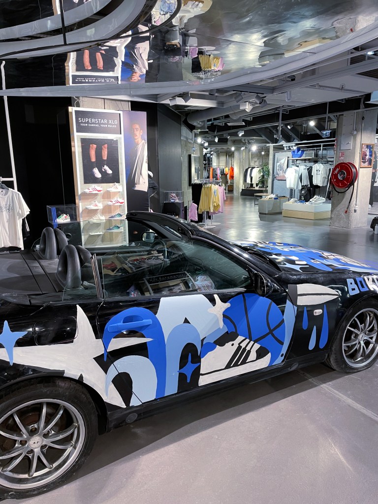 En Juillet 2023, j’ai eu l’honneur de collaborer avec Adidas Originals dans le cadre d’un projet unique réalisé en partenariat avec l’agence Togeather. Pour cet événement, j’ai personnalisé une voiture Mercedes, qui a été exposée dans la boutique Adidas Originals sur les Champs-Élysées. Cette création mêle mon univers artistique à l’esthétique iconique de la marque, offrant une œuvre audacieuse et contemporaine qui célèbre l’innovation et le style urbain. Une expérience enrichissante qui illustre la rencontre entre l’art, la mode et la culture automobile.